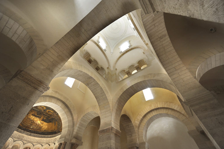 Restauré au 19e siècle, l’oratoire est célèbre pour son architecture carolingienne et sa mosaïque unique en France représentant l’Arche d’Alliance entourée d’anges.