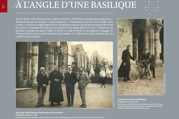 Dans le cadre du 80e anniversaire de l’arrestation et de la mort de Max Jacob, le Belvédère a rendu hommage à l’artiste à travers une exposition itinérante illustrée d’extraits de sa correspondance, de gouaches et de photographies de l’homme dans les lieux emblématiques de sa vie à Saint-Benoît-sur-Loire.